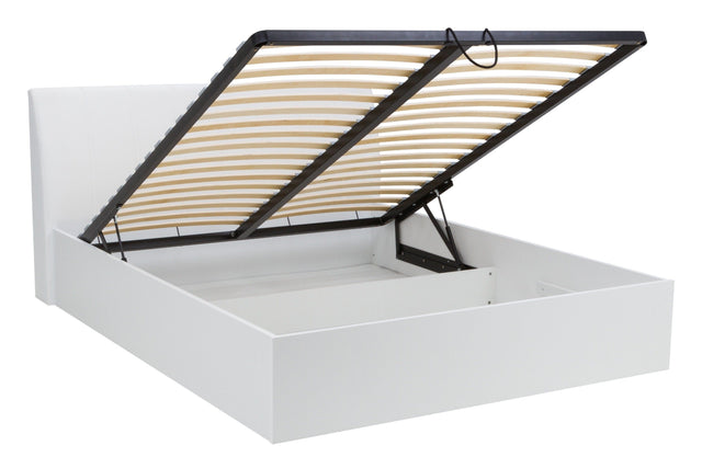 This stunning and stylish bed is the room's focal point. Finished in a white matt colour scheme and crafted from 16mm laminated board, the eye-catching contemporary design will get all the attention it deserves. It comes with a pair of large storage compartments underneath the slatted base, functional and practical, where you can hide away all your things, from your bedding and linen to blankets and comforters. Available in two different sizes, it will fit easily within any bedroom setting.