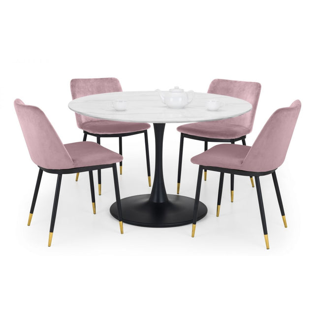 Holland Round Pedestal Table & 4 Delaunay Pink Chairs - 1.2m Round / Pink / Velvet is backordered and will ship as soon as it is back in stock.