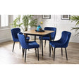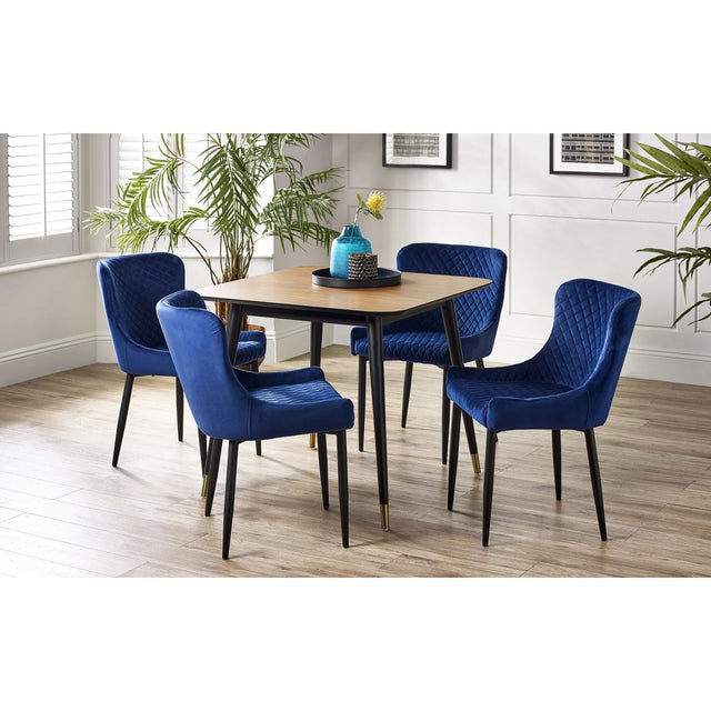 Discover the Findlay Square Dining Table & Luxe Blue Velvet Chairs – Compact Elegance with a Retro-Modern Twist