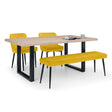 Revitalize your dining space with the Berwick Dining Table, a stunning centerpiece crafted with a rustic oak finish that highlights the natural wood grain. Paired with industrial-style black legs for a stable and striking base, this table merges rustic allure with contemporary design. Complemented by one Luxe Low Mustard Bench and two Luxe Mustard Chairs, this dining set introduces a bold splash of color and modern sophistication, ideal for any dining area seeking a statement piece.