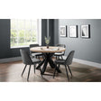 Transform your dining area with the Berwick Round Table, which combines the raw appeal of industrial design with the refined simplicity of modern aesthetics. Featuring an easy-to-clean oak finish top and a sturdy black frame, this table is designed to offer a relaxed yet stylish dining experience. Complementing this rugged, chic table are the Burgess Chairs, which add a touch of elegance and modernity to any space with their hand-stitched edges and soft-touch velvet finish.