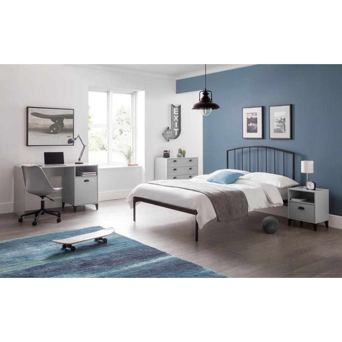 The Lakers Locker Desk is a perfect blend of industrial charm and practicality, designed to elevate your workspace. Crafted from solid pine and MDF, this desk features a striking metal effect grey lacquer finish, complemented by black metal effect legs and handles. Its unique ventilation detailing is inspired by vintage lockers, adding a touch of character to your office or study area.
