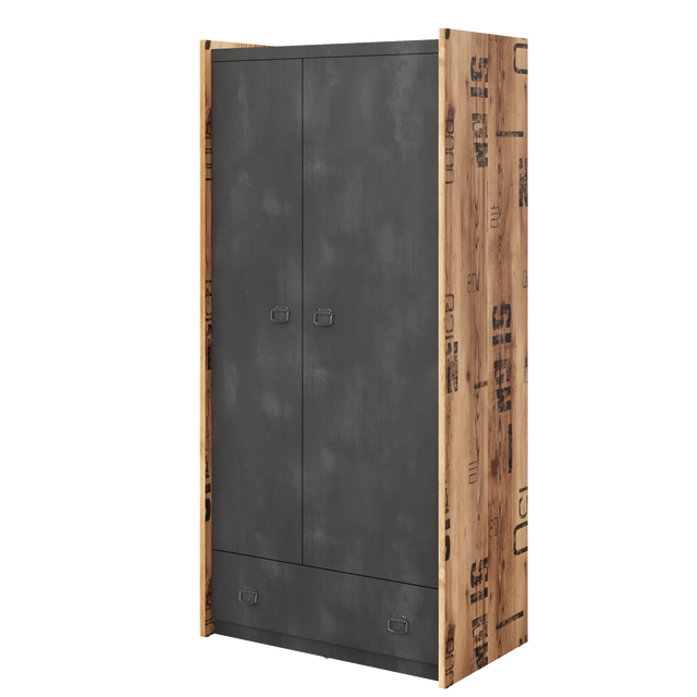 Designed to provide tremendous storage capacity, this wardrobe includes five closed compartments, two open compartments, one spacious drawer, and a generously sized hanging rail, ensuring plenty of space for both professional and casual clothing. The antique-style metal handles add to its rustic-industrial charm, making it a perfect fit for loft-style or modern interiors.