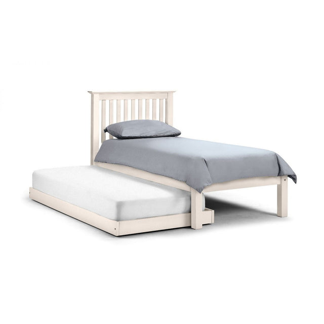 The substantial posts and capping of the Barcelona Hideaway Bed ensure robustness and durability, while the solid pine slatted base supports your mattress, enhancing comfort and prolonging its life. The stone white finish is a tasteful off-white color, not a brilliant white, adding a subtle, refined touch to any bedroom decor.