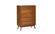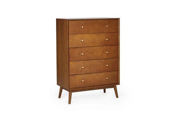 Introduce timeless elegance to your bedroom with the Lowry Bedroom Collection, a retro-inspired design that combines style and functionality. The Lowry 5-Drawer Chest is meticulously crafted from exquisite cherry ash wood veneer, featuring tapered legs and gold-framed knobs for a refined look. With five spacious drawers, it offers ample storage for clothing, linens, and other essentials while enhancing the overall character of your space.